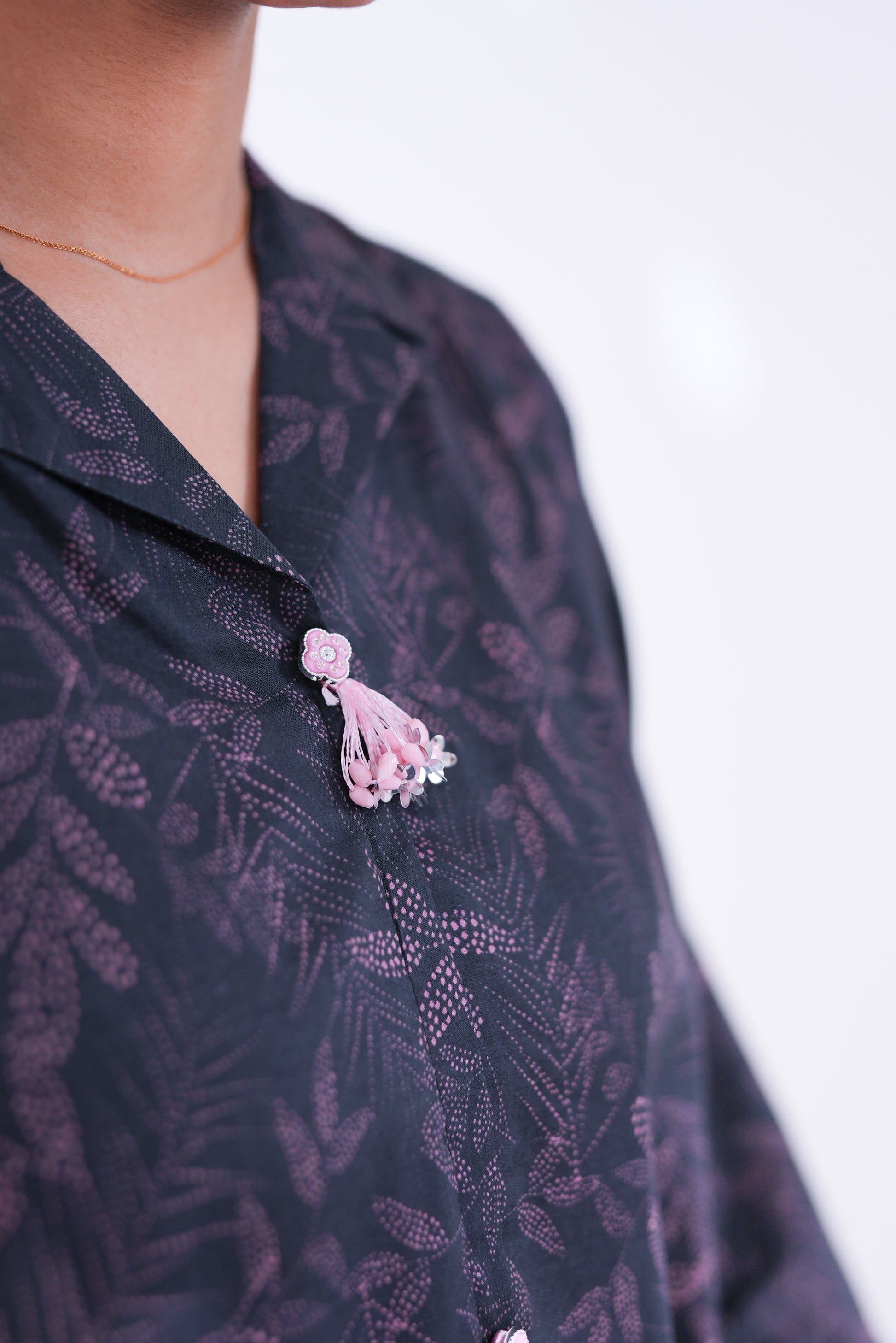 - Two-piece outfit with an off-white base and soft pink & purple floral pattern